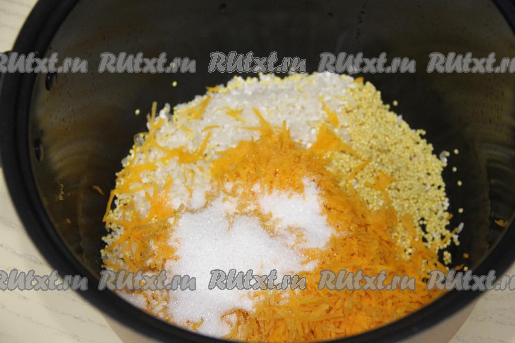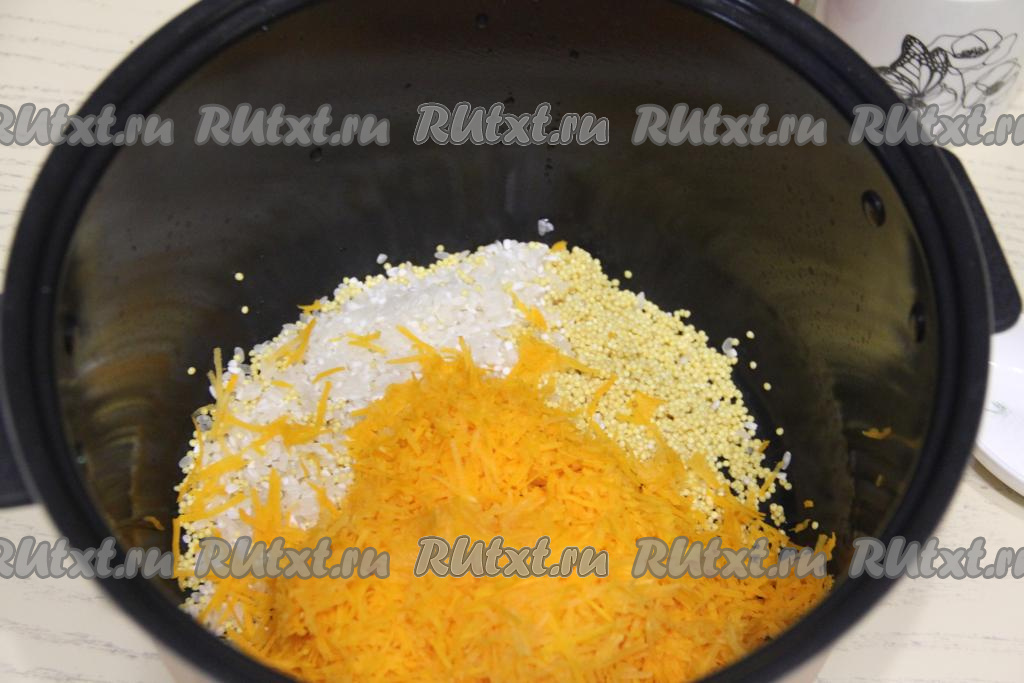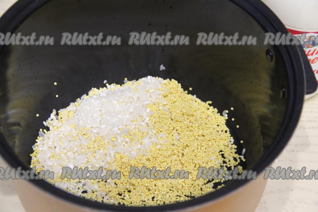 Рис высыпать в сито, хорошо промыть под проточной водой, дать стечь лишней воде, выложить в чашу мультиварки. Затем пшено выложить в сито и тщательно промыть горячей водой (благодаря горячей воде, из пшена уйдёт горечь). Затем дать стечь лишней жидкости с пшена, после этого добавить в чашу мультиварки, в которой уже находится промытый рис.
