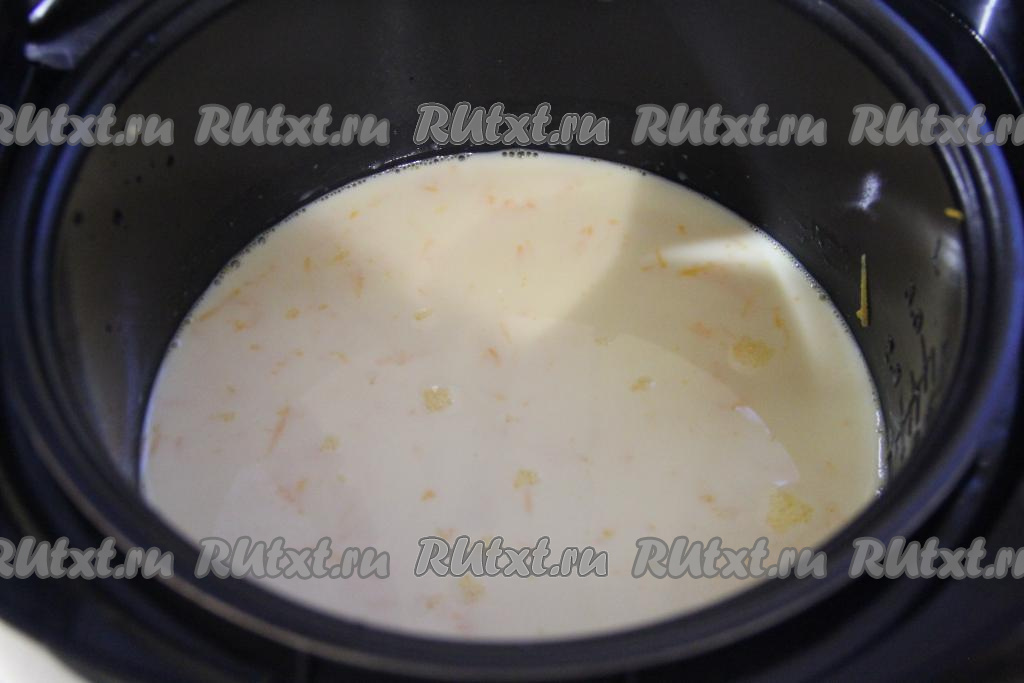 Влить молоко и 400 миллилитров воды, перемешать, закрыть крышку мультиварки.