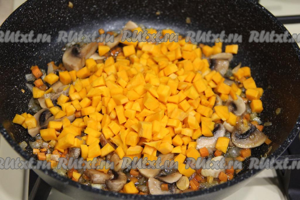 Затем добавить в сковороду тыкву, нарезанную на мелкие кубики, перемешать овощи с грибами.