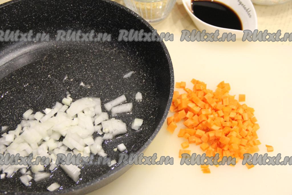 К обжаренному луку добавить морковку, нарезанную на мелкие кубику, перемешать, обжаривать 3-4 минуты, периодически перемешивая.