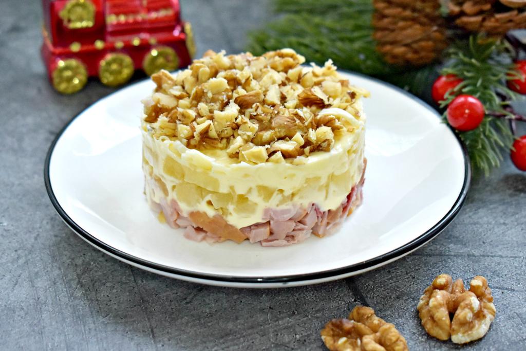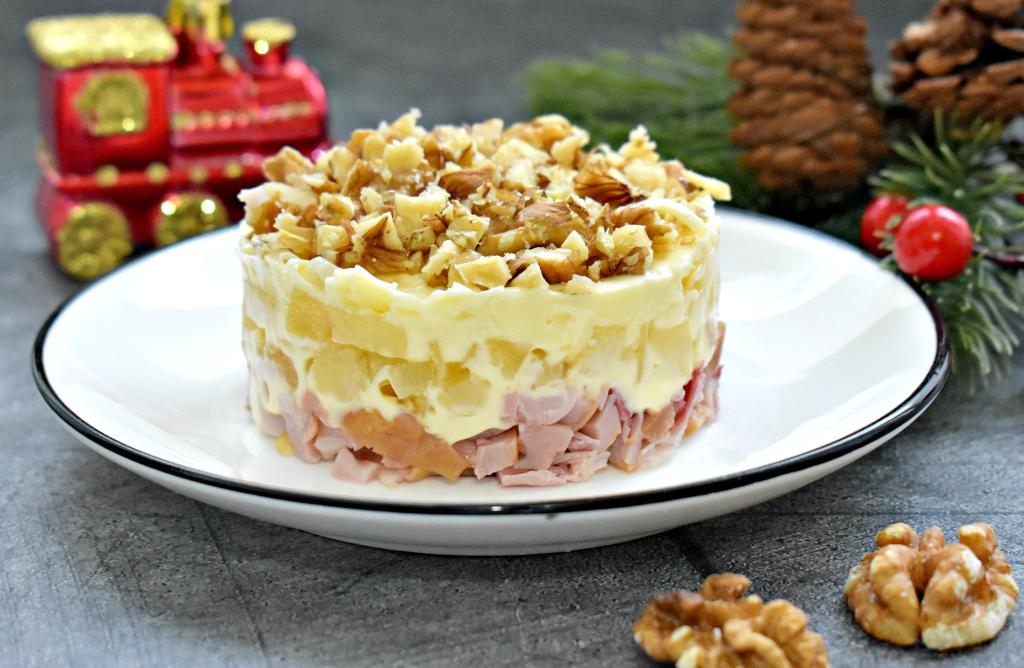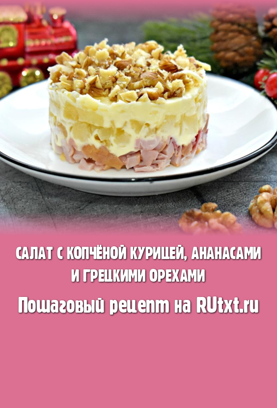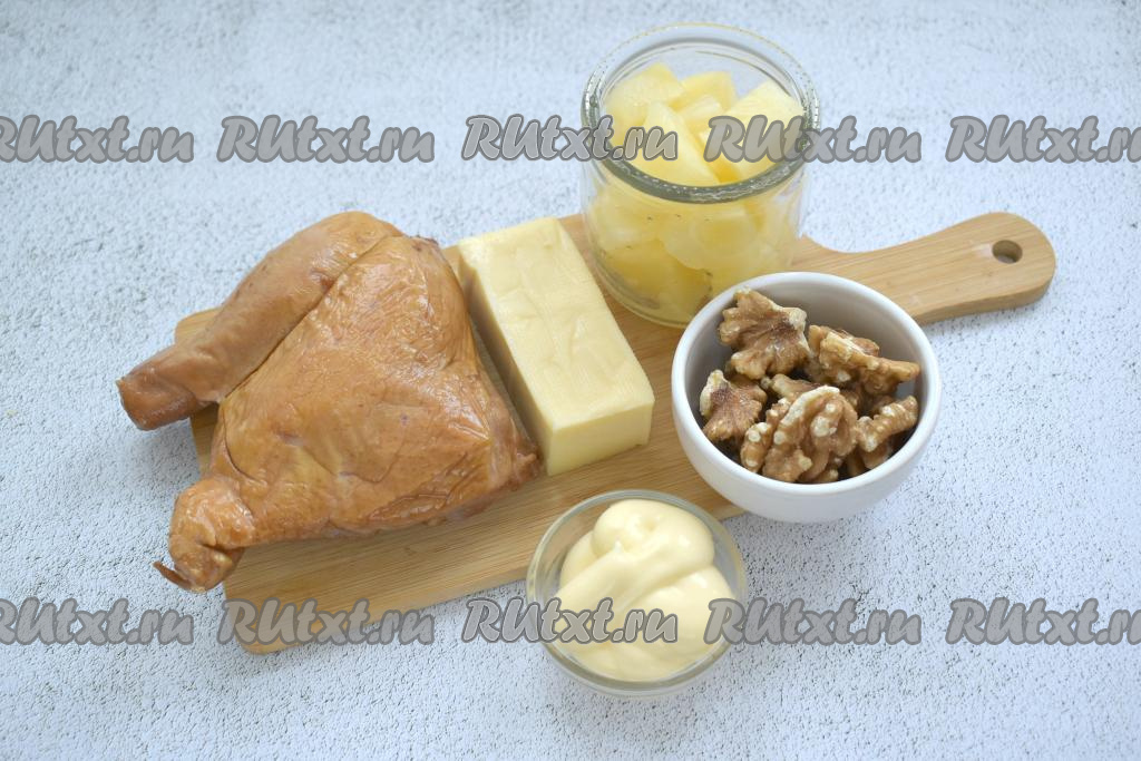 Предлагаю к праздничному столу приготовить слоёный салат с копчёной курицей, ананасами, грецкими орехами и сыром. Рецепт простой, формируется блюдо достаточно быстро, а получается аппетитным и очень вкусным. Сочетание ингредиентов очень удачное. Копчёная курица придаёт салату насыщенный вкус и аромат, ананасы добавляют лёгкую фруктовую нотку, грецкие орехи делают его более пикантным. Уверена, такой салат понравится многим!