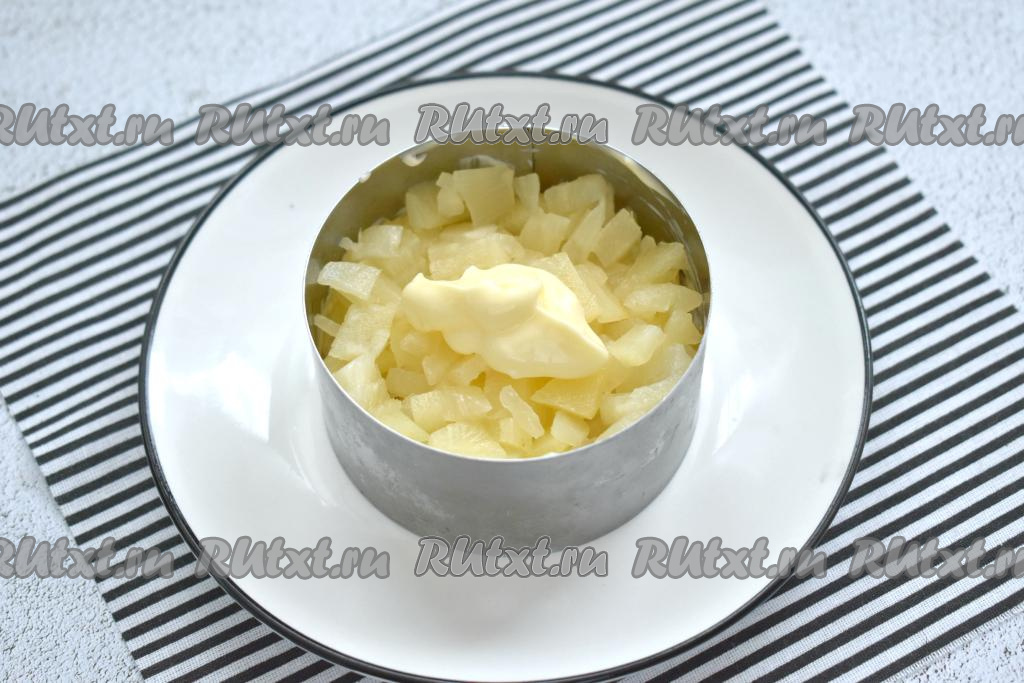 Консервированный ананас тоже нарезаем на маленькие кубики, равномерно раскладываем по двум кольцам, смазываем майонезом, слегка утрамбовывая.