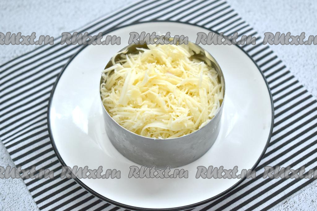 Следующим слоем раскладываем сыр, натёртый на крупной тёрке.