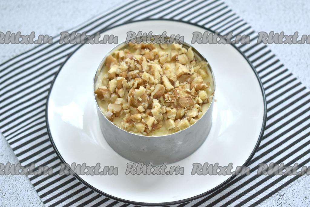 Очищаем грецкие орехи. По желанию, грецкие орехи можно подсушить на сухой сковороде, периодически помешивая, а затем убрать с огня и дать полностью остыть. Нарезаем орехи на небольшие кусочки и раскладываем по двум кольцам в качестве завершающего слоя салата.