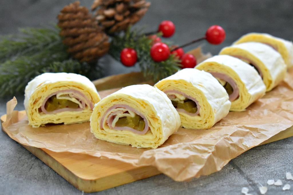 Затем аппетитный, вкусный рулет из лаваша с начинкой из ветчины, огурца и сыра нарезаем острым ножом на порционные кусочки и подаём к столу.