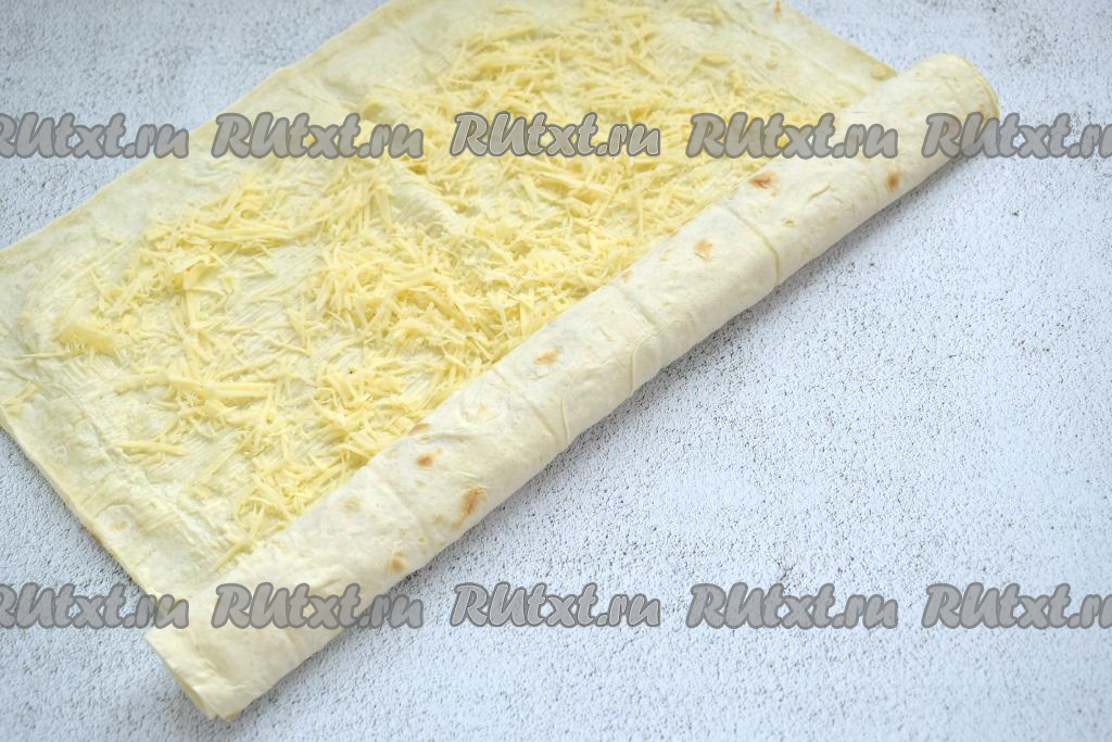 Поверх смазанной части лаваша равномерно распределяем сыр, натёртый на мелкой тёрке.