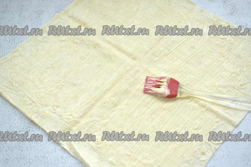 Тонкий лаваш расстилаем на столе. Отступив от краёв лаваша примерно по 1 сантиметру, с помощью кулинарной кисти смазываем лаваш майонезом.