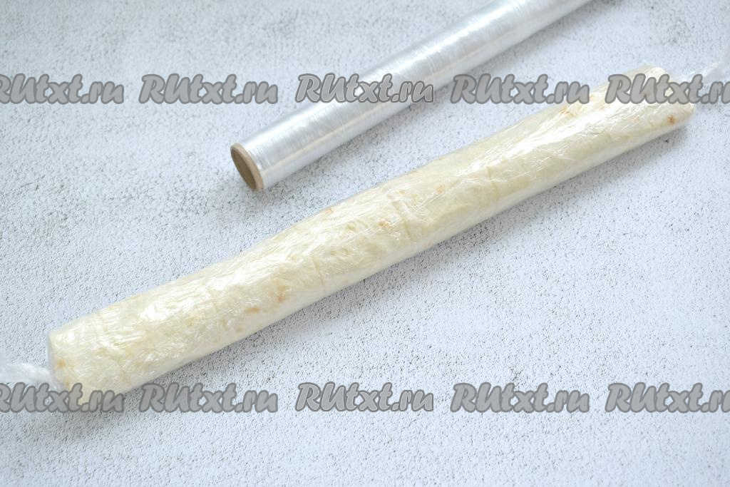 Получившийся рулет из лаваша заворачиваем в пищевую плёнку и, как минимум, на 1 час убираем в холодильник.