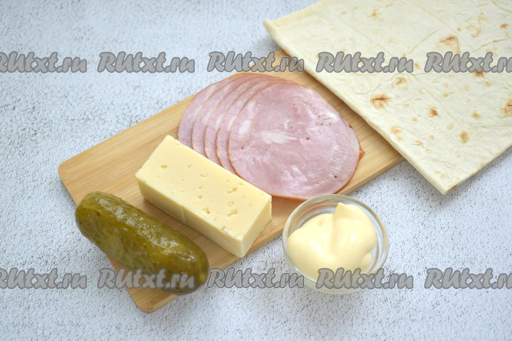 Подготовить ингредиенты. Я использовала тонкий лаваш размером 37 сантиметров на 37 сантиметров. Ветчину я купила уже нарезанную на тонкие ломтики. Но можно безусловно тонко нарезать и в домашних условиях.