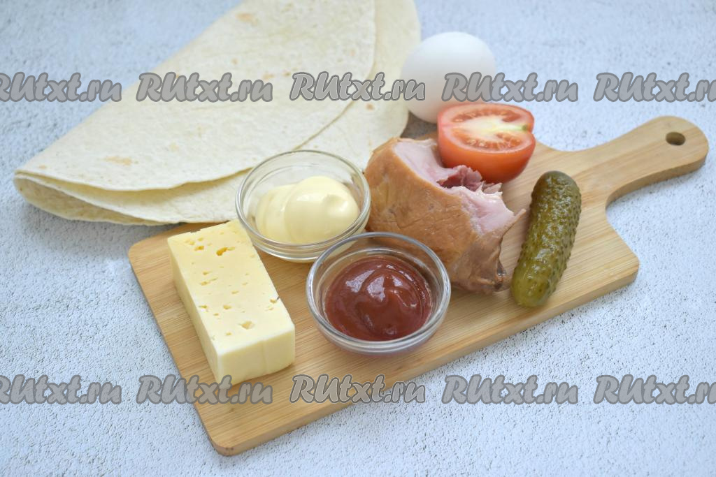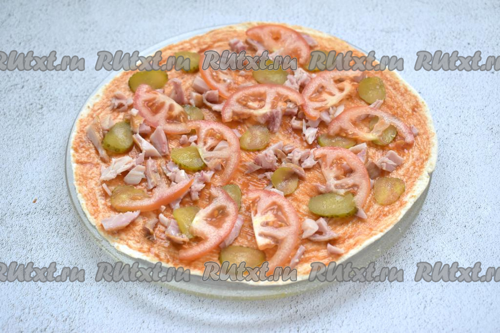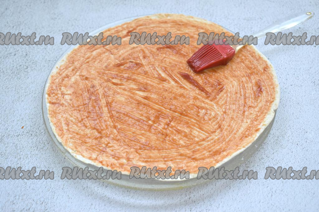 Смазываем лепёшку с помощью кулинарной кисти томатным соусом (или кетчупом).