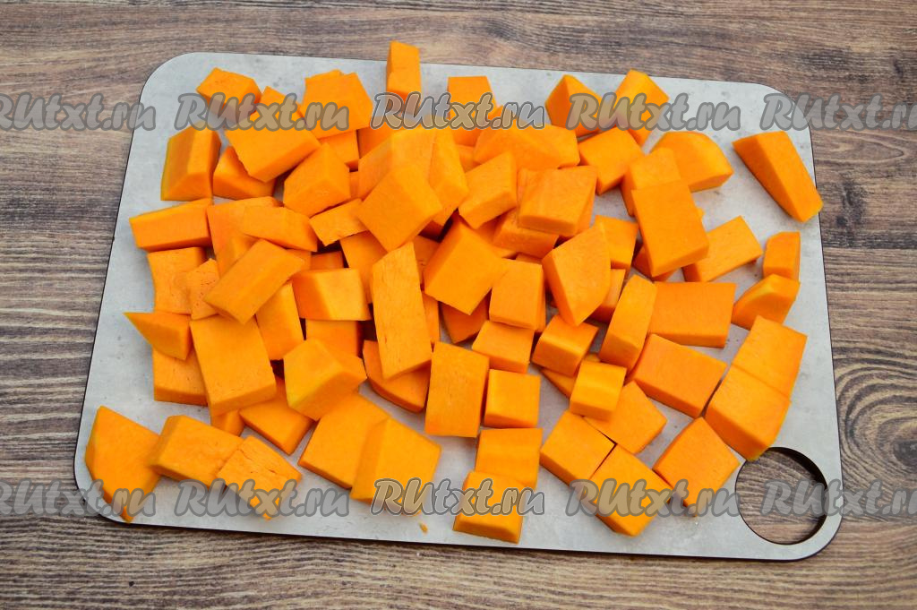 800 грамм тыквы, предварительно очищенной от кожуры, семечек и волокон, нарезать на небольшие брусочки (примерный размер брусочков 2 сантиметра на 3 сантиметра).