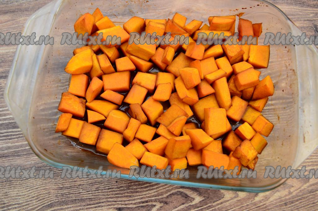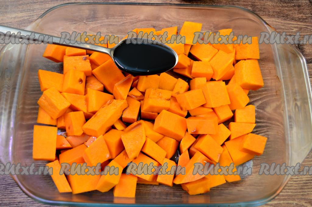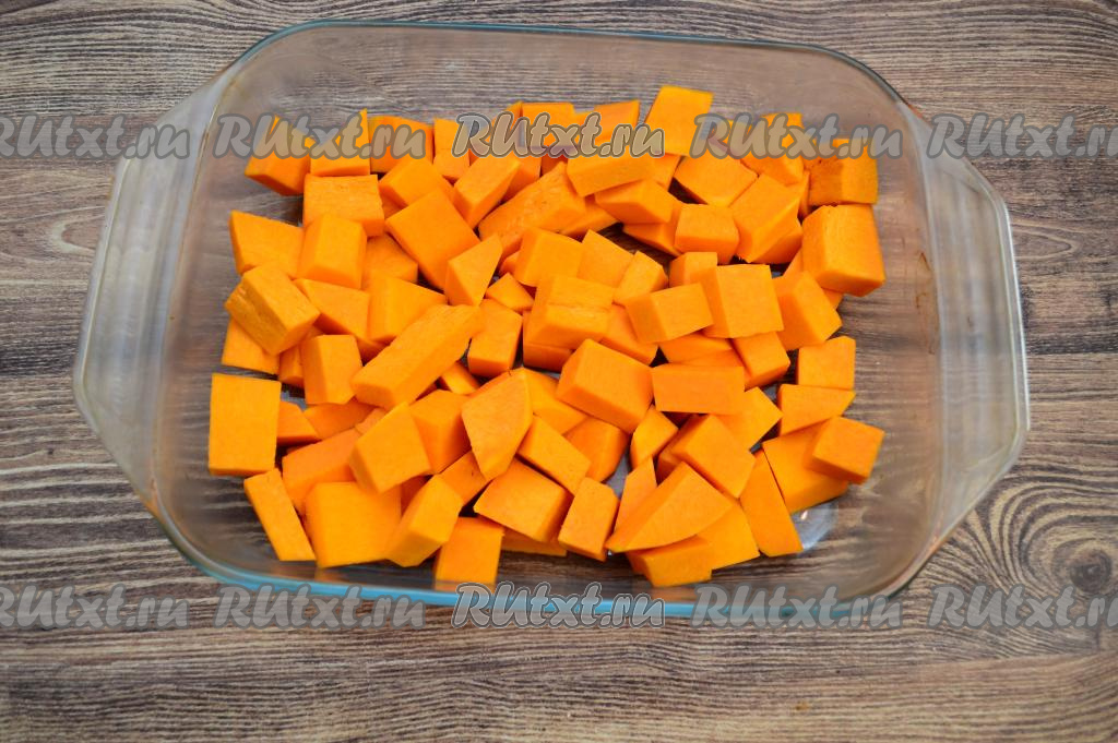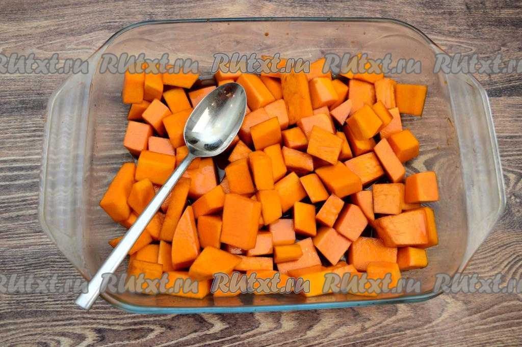 Форму для запекания нужно брать достаточно большую, чтобы тыква в ней лежала в 1-2 слоя. Смазывать форму маслом не нужно.