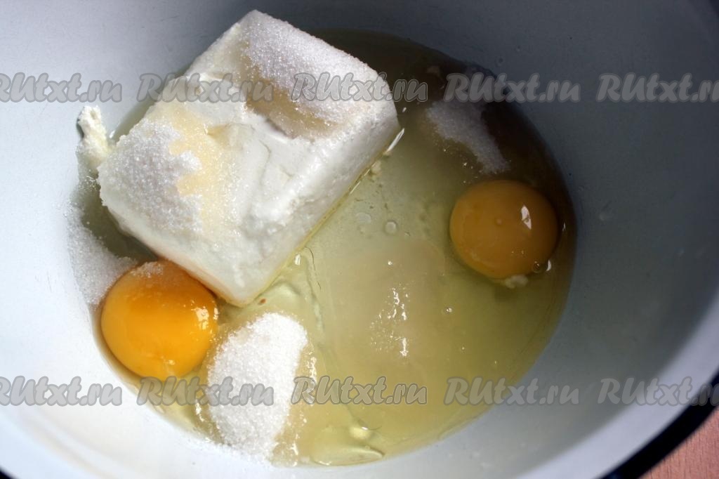 Соедините творог, яйца сахар, растительное масло и перемешайте.