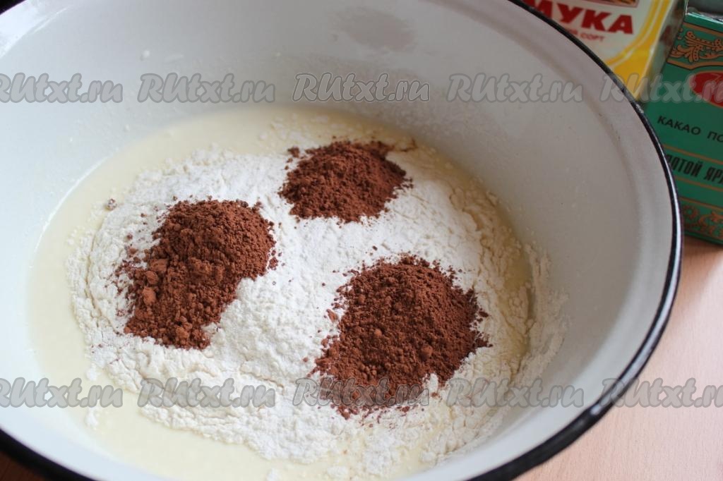 Затем добавьте просеянную муку, какао, разрыхлитель и соль.