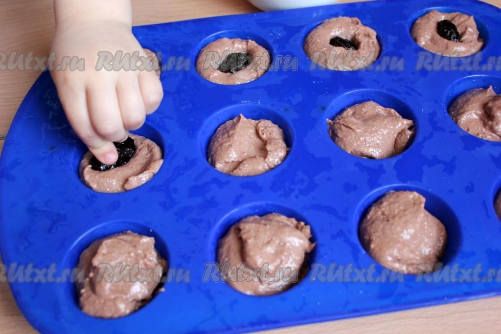 Разложите тесто по смазанным формочкам или по силиконовым и в каждый кекс добавьте начинку. Тут чернослив, а в следующих двенадцати кексах - кусочки шоколада.