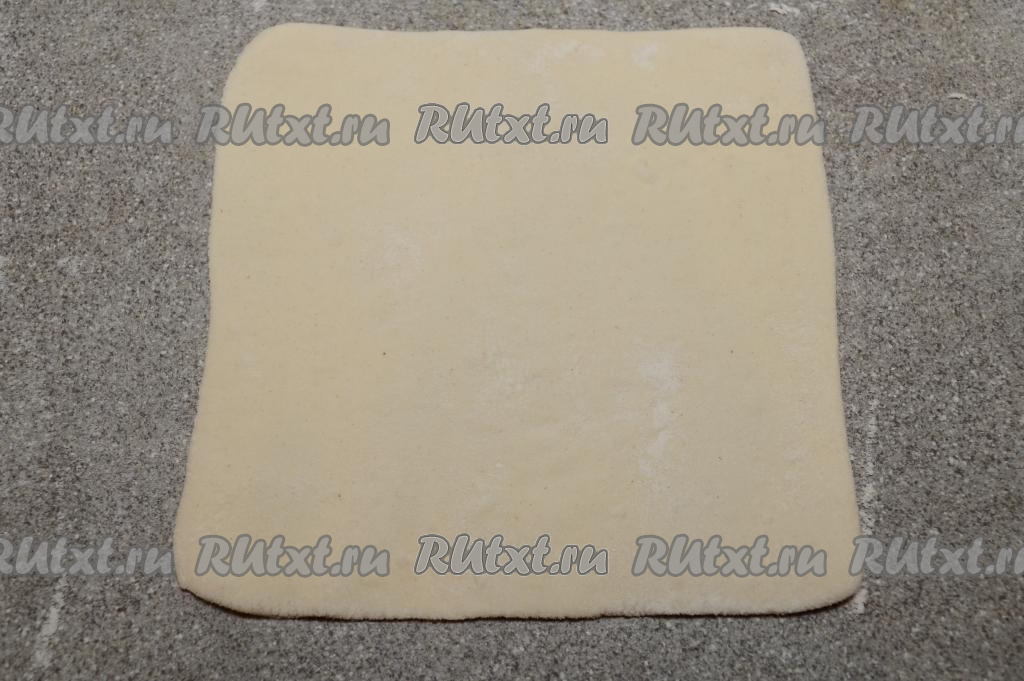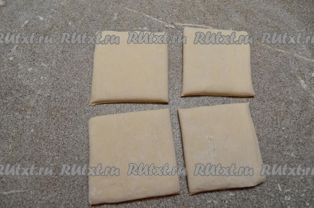 Каждую часть слоёного теста на слегка присыпанном мукой столе раскатать в квадрат со стороной 15 сантиметров (ориентировочно толщина теста после раскатки должна быть около 2 миллиметров).