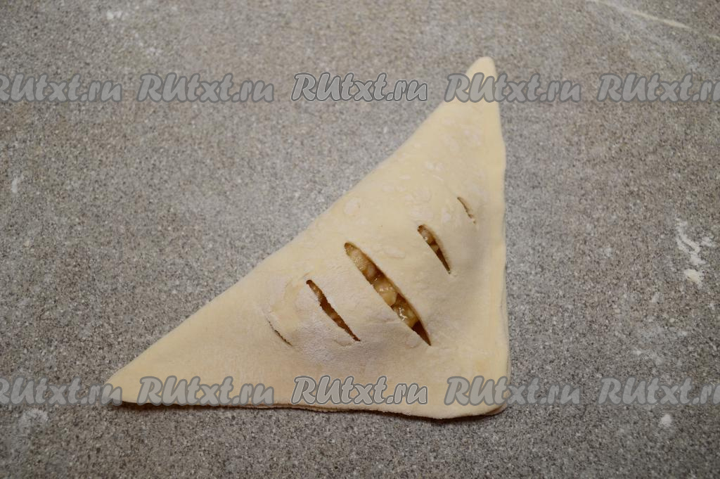 Накрыть начинку стороной с разрезами, получится треугольная слойка.