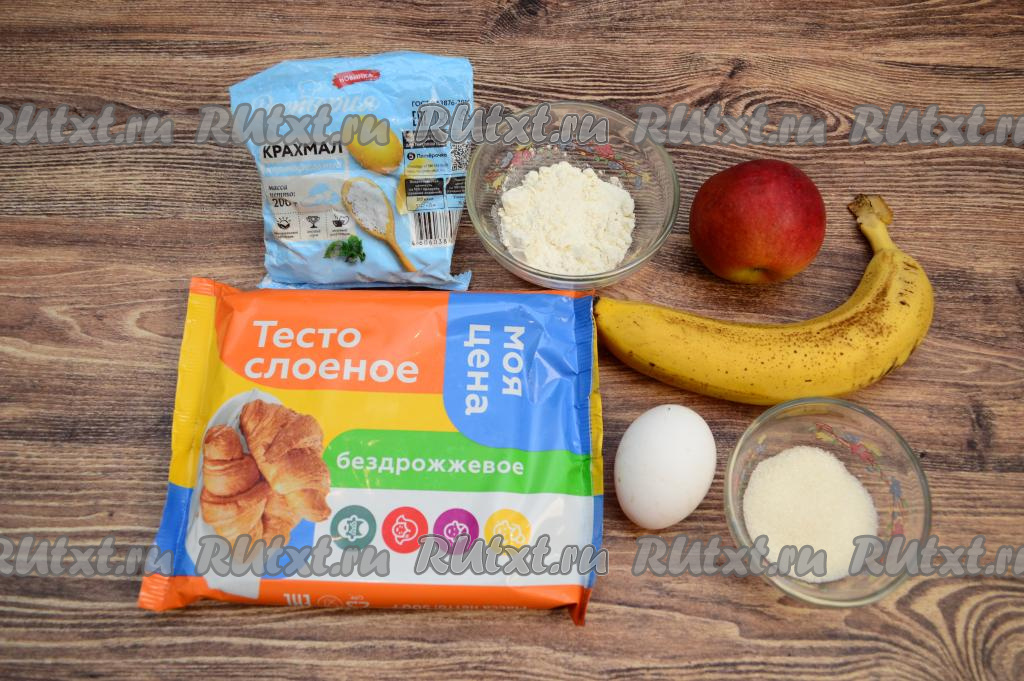 Подготовить продукты для приготовления слоек с бананом и яблоком. Заранее разморозить слоёное тесто. Для этого рецепта можно взять как дрожжевое, так и бездрожжевое слоёное тесто (я использовала бездрожжевое тесто). Банан выбирайте спелый, чтобы его можно было просто разминать вилкой.