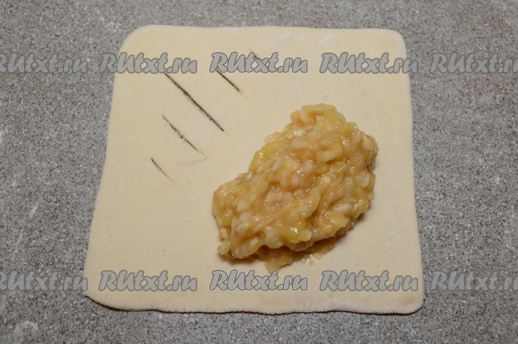 На угол каждого квадрата, противоположный углу с разрезами, отступая от краёв по 1,5 сантиметра, выложить примерно 1,5 столовых ложки начинки из банана и яблока.