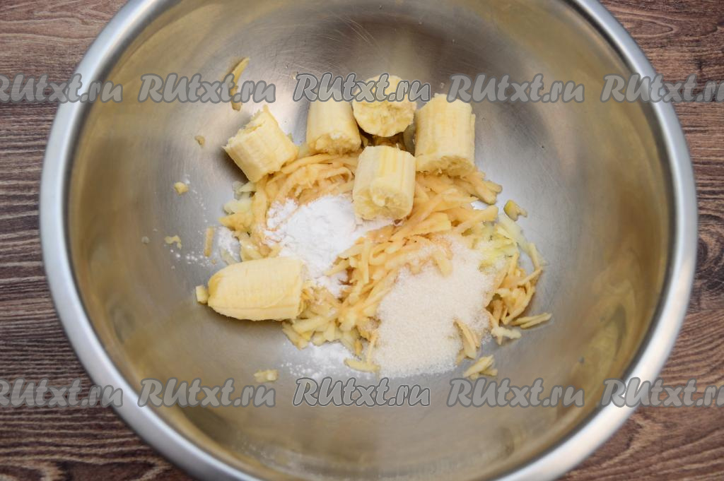 Яблоко очистить от кожуры и натереть на крупной тёрке в глубокую миску. Туда же выложить очищенный банан, разломанный на кусочки, всыпать сахар и крахмал.
