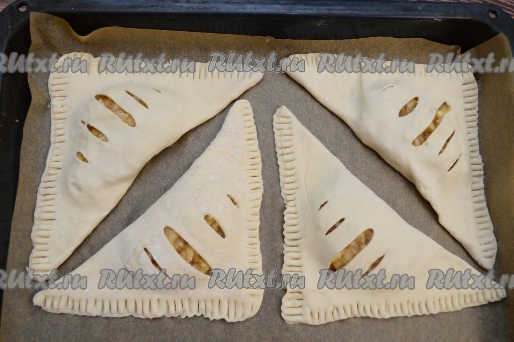 Аналогично сформировать все слойки с бананово-яблочной начинкой. Противень застелить бумагой для выпечки. Выложить на противень заготовки слоек.