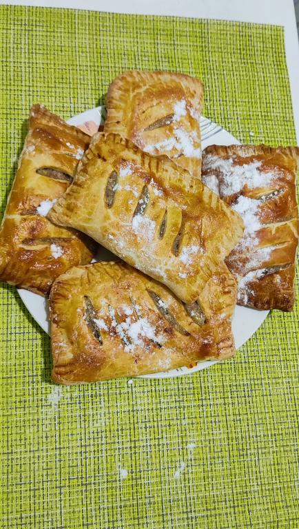 А вот как такая слойка выглядит в разломе. Сочетание большого количества начинки из банана с яблоком и нежного слоёного теста делает эту выпечку очень вкусной и аппетитной!