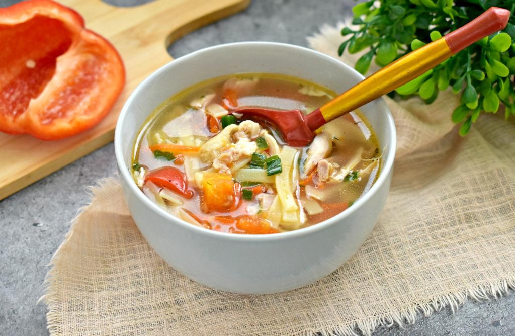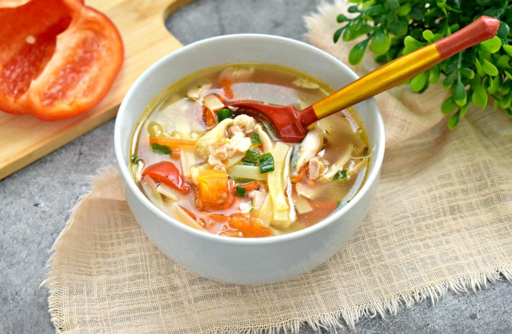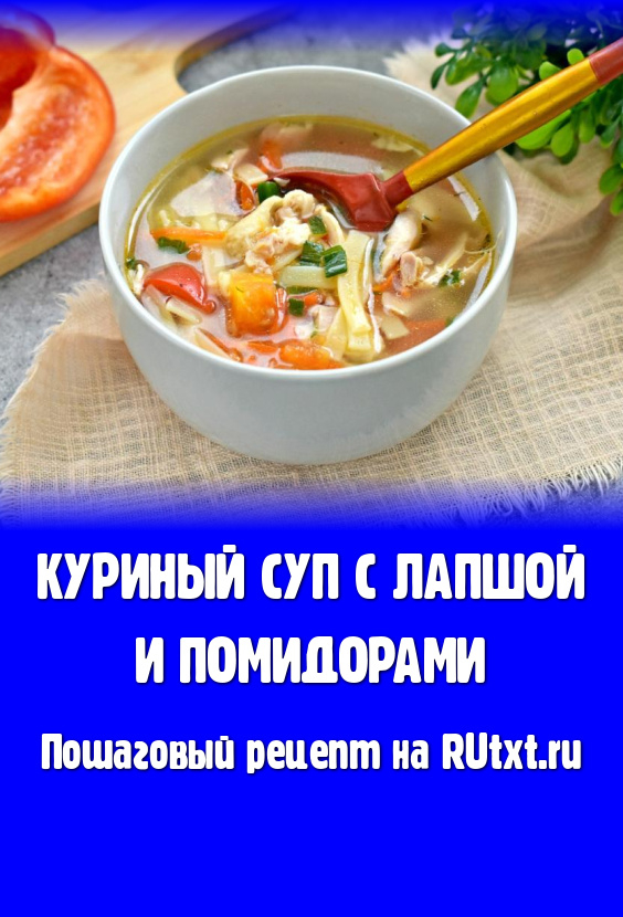 Я часто готовлю супы с курицей. В этот раз сварила куриный суп с лапшой и помидорами. Это первое блюдо готовится без добавления картошки, а получается насыщенным, ярким и очень вкусным. Советую и вам разнообразить своё повседневное меню этим куриным супом с овощами и лапшой!