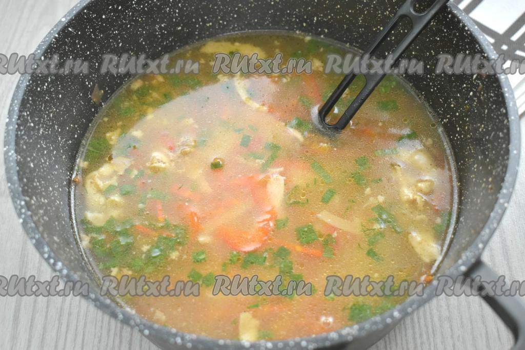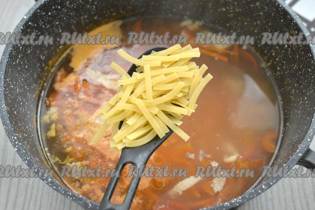 Спустя это время добавляем в кастрюлю лапшу, перемешиваем, даём закипеть и варим на небольшом огне 5-6 минут (или в течение времени, указанного на упаковке лапши, которую вы готовите).
