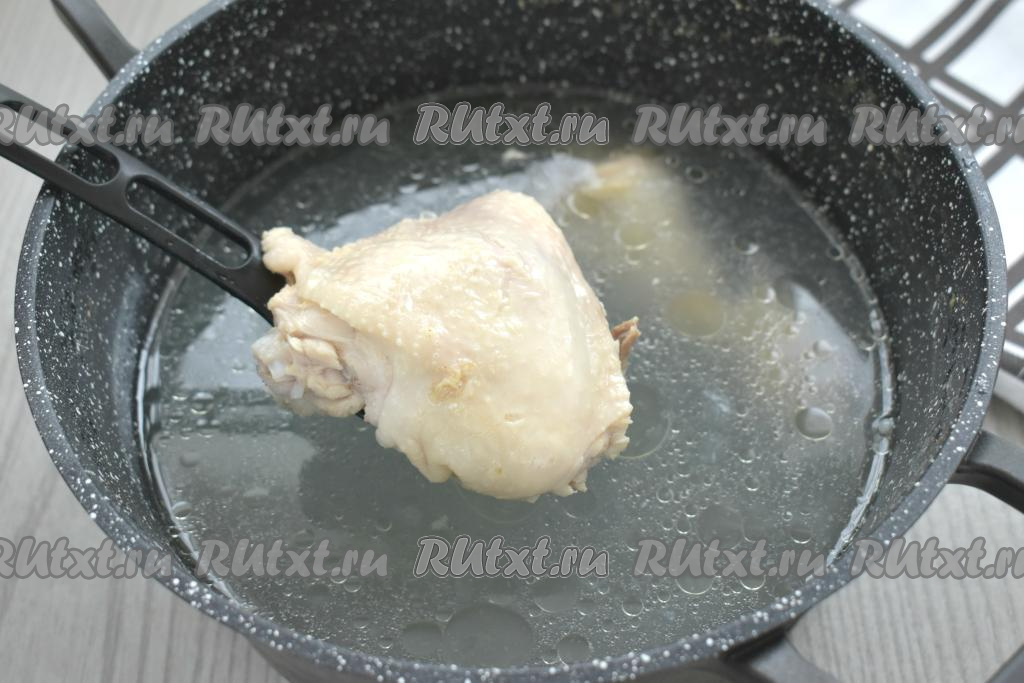 Части курицы (я взяла куриное бедро и голень) моем, кладём в кастрюлю и заливаем 2 литрами холодной воды, ставим на огонь. Доводим до кипения и варим куриный бульон минут 40 (до готовности куриного мяса). Затем убираем кастрюлю с огня, отваренные части курицы достаём из кастрюли, даём остыть. Остывшее мясо отделяем от костей, затем нарезаем на небольшие кусочки. Бульон, если необходимо, процеживаем, возвращаем в кастрюлю, добавляем в него нарезанное мясо, ставим на огонь, солим.