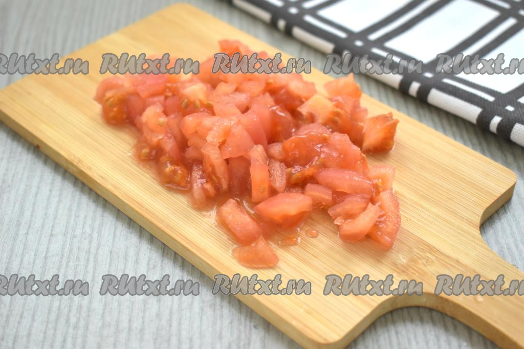 Нарезаем помидоры без кожицы на небольшие кубики.