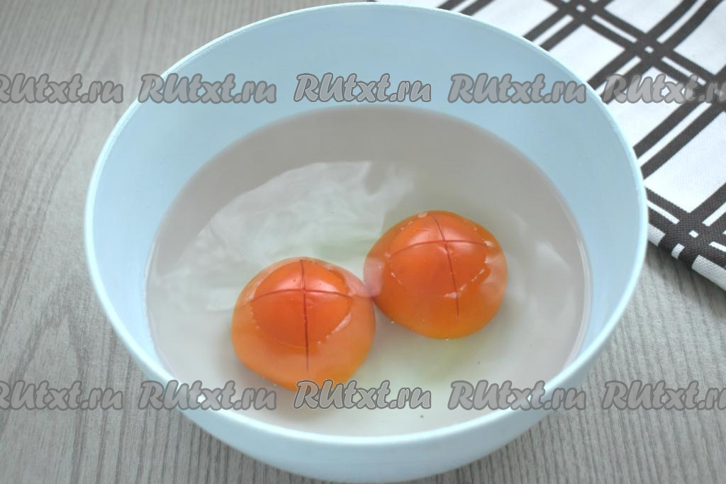 Благодаря тому, что надрезанные помидоры помещаются в кипяток, кожура с них будет сниматься очень легко.