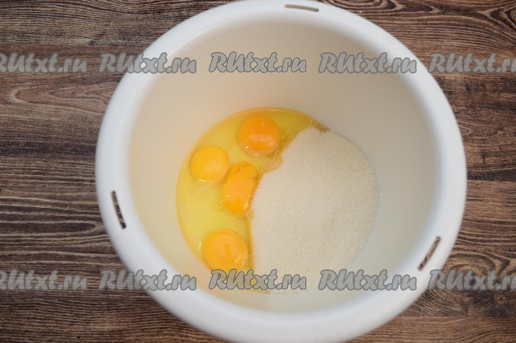 В чашу, в которой будет удобно взбивать миксером, выложить сырые яйца, всыпать 250 грамм сахара.