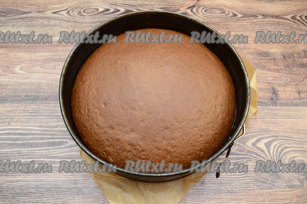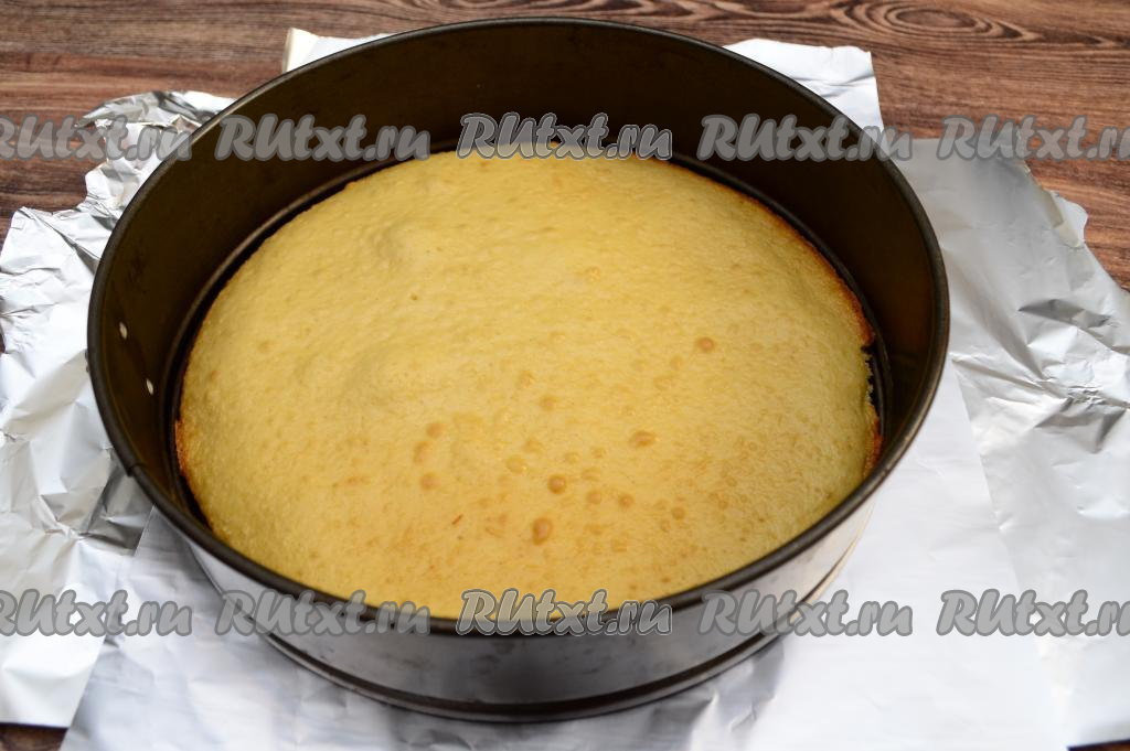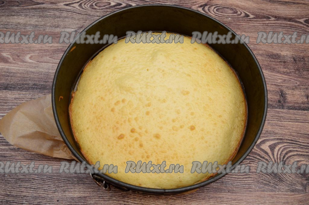 Разъёмную форму для выпечки диаметром 26 сантиметров застелить пергаментом. Вылить в форму 1/3 бисквитного теста и отправить выпекаться в разогретую до 180 градусов духовку на 15 минут.