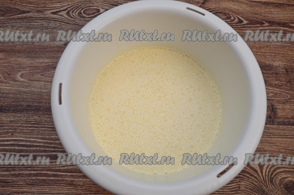 Взбить сахар с яйцами на высоких оборотах миксера в течение 7 минут. Масса должна побелеть и увеличиться в объёме.