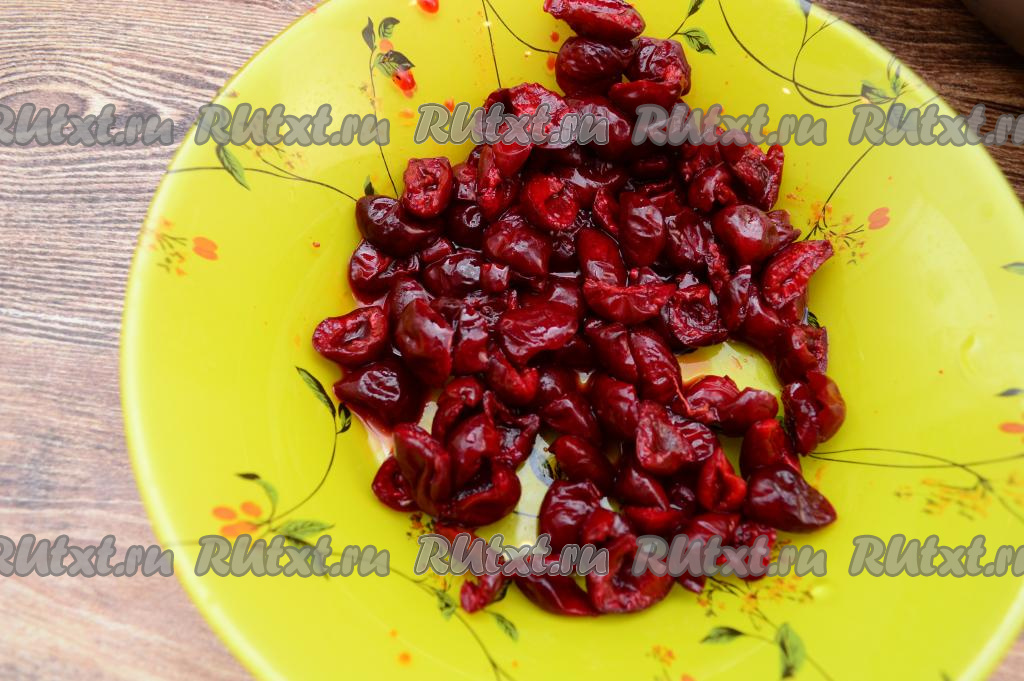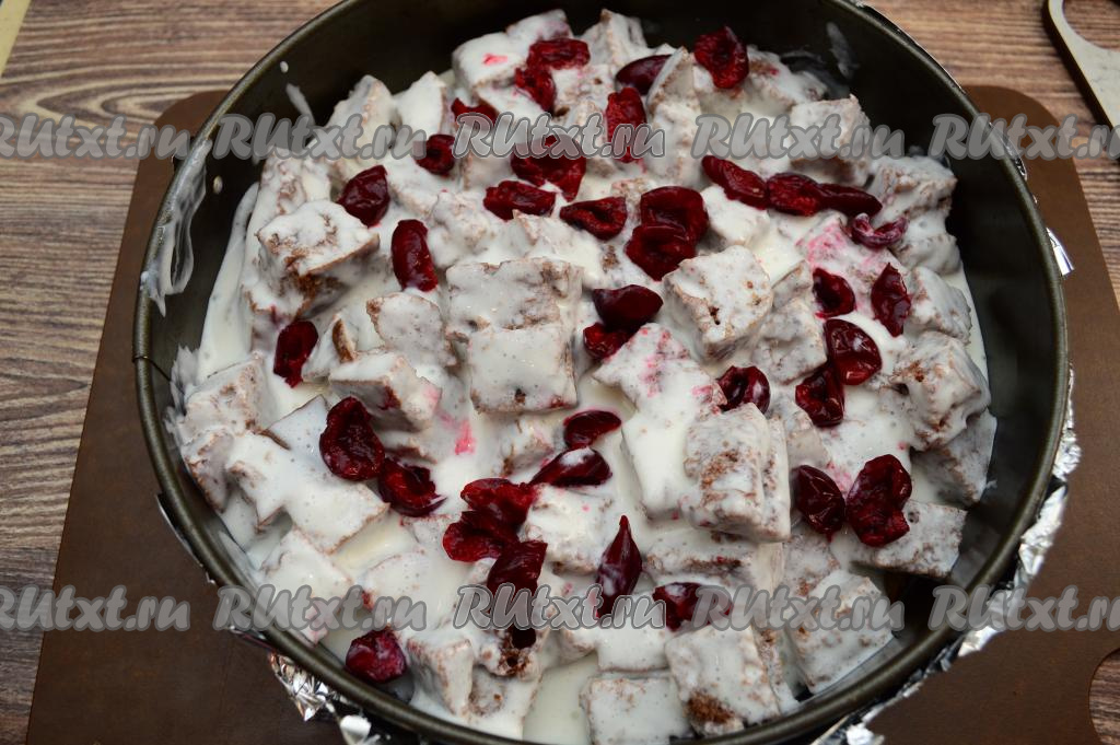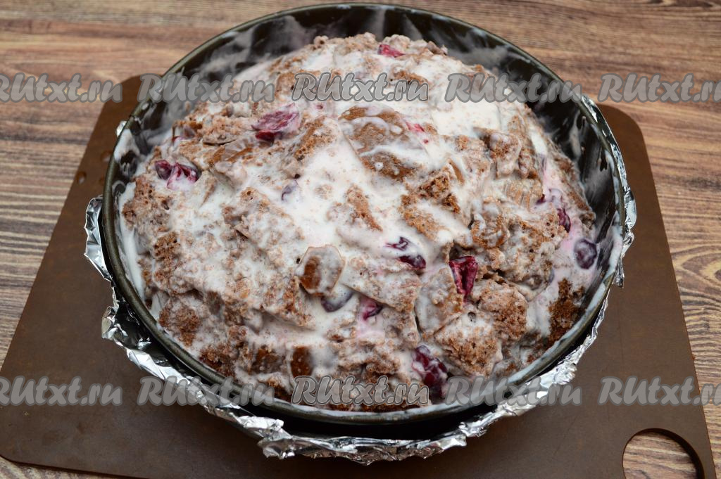 Выкладывать в форму с основой кусочки бисквита, чередуя с кусочками вишни. Можно немного подливать сметанного крема.