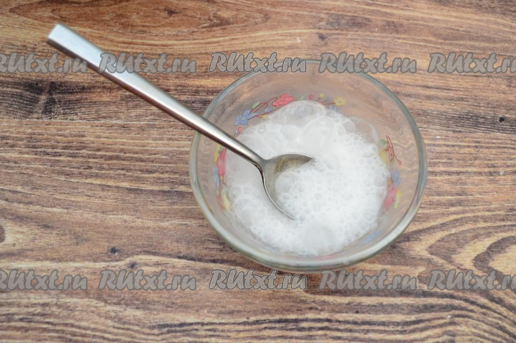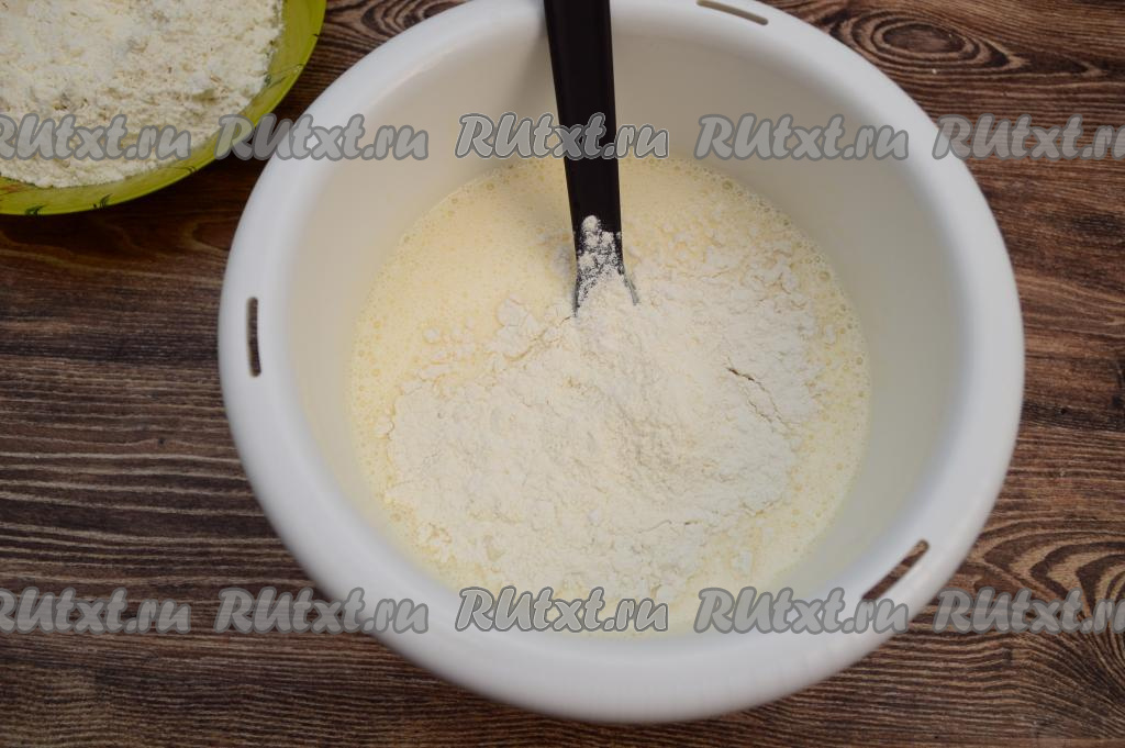 Влить погашенную соду в чашу, перемешать и начать понемногу добавлять муку, каждый раз полностью вмешивая её движениями лопатки "снизу вверх".
