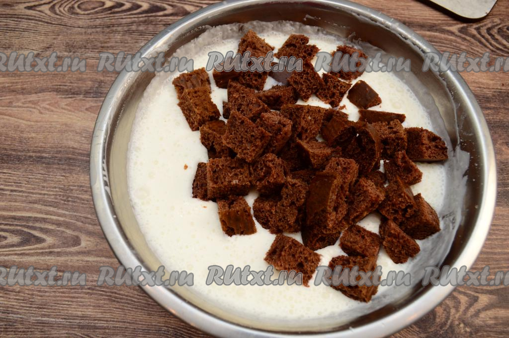 Остывший шоколадный бисквит нарезать на кусочки размером примерно 2 на 3 сантиметра.