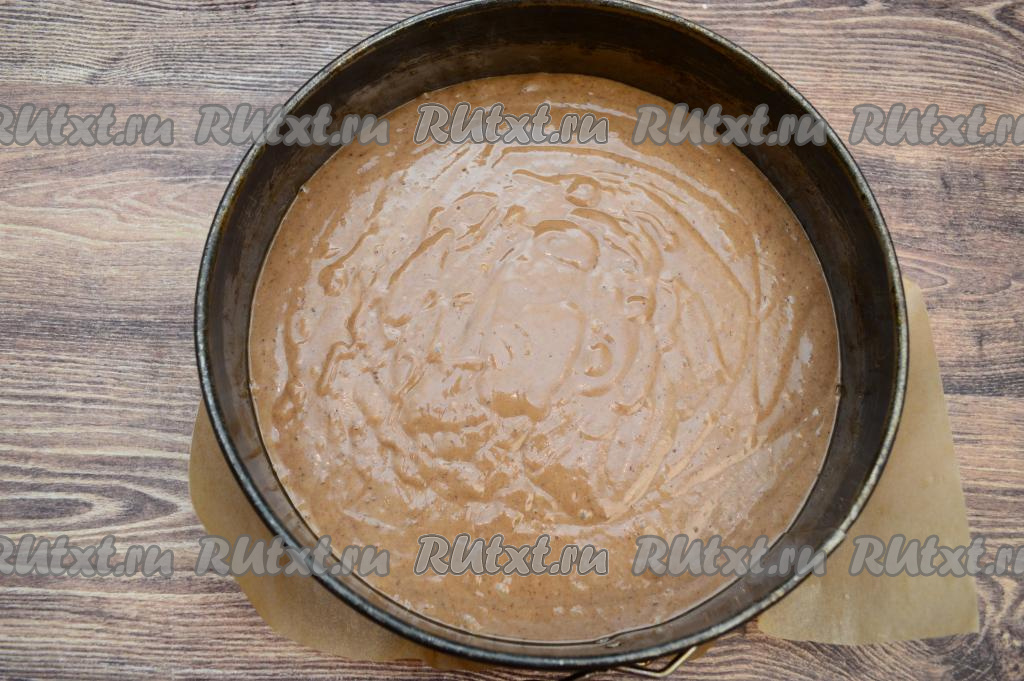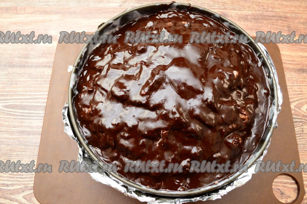 Можно выпекать шоколадный бисквит в той же форме, я же воспользовалась второй разъёмной формой диаметром 23 сантиметра, чтобы не тратить время на остывание первого бисквита. Форму застелить пергаментом, вылить в форму шоколадное тесто и отправить в духовку, разогретую до 180 градусов, на 25-30 минут.