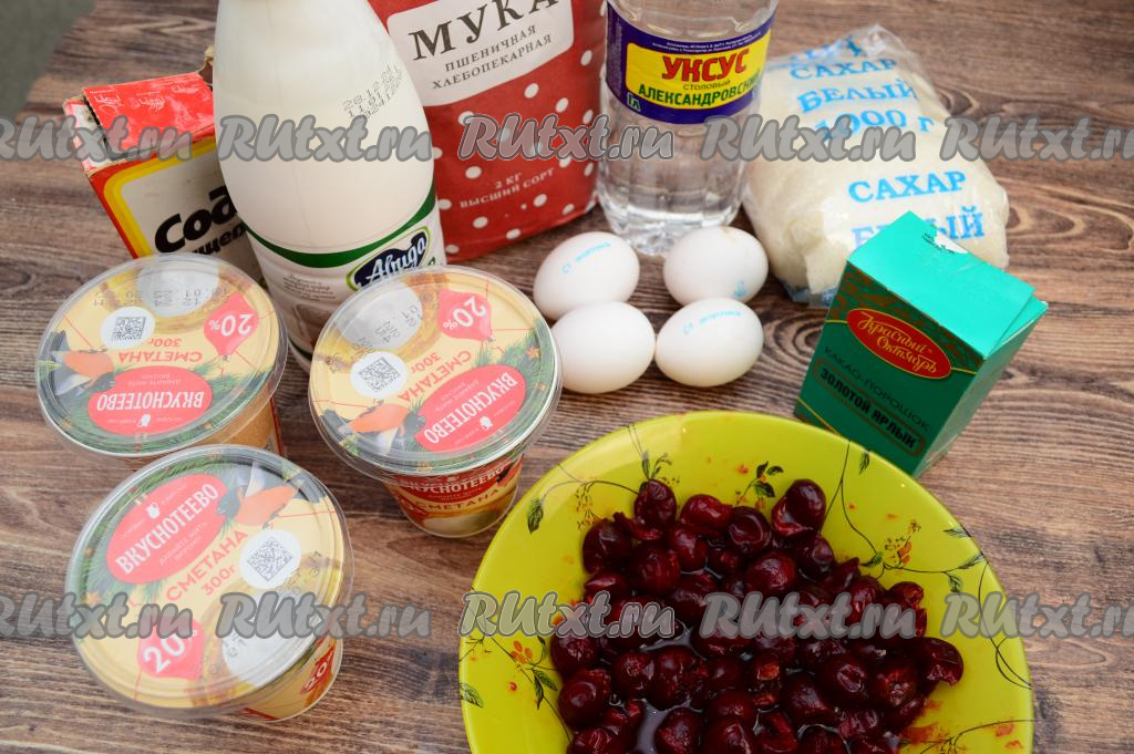Подготовить продукты для бисквита и сметанного крема. Сметану берите обязательно жирностью не менее 20%, кефир желательно взять жирностью 3,2% или выше. Я использовала замороженную вишню без косточек, можно взять конечно же и свежие ягоды, предварительно вымыв их и удалив косточки. Если ягоды заморожены, их нужно полностью разморозить, лишнюю воду слить. Я ещё слегка обсушиваю размороженные (или свежие) ягоды без косточек на бумажном полотенце, чтобы убрать лишнюю влагу.