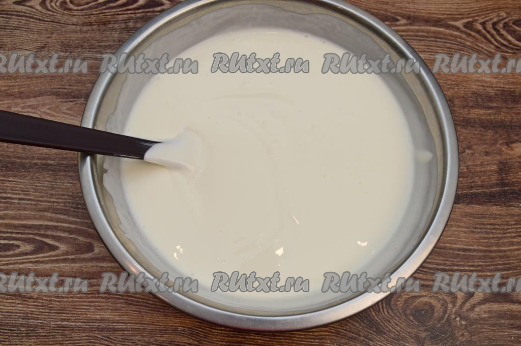 Влить в чашу понемногу отложенные ранее 400 миллилитров кефирно-сметанной массы, непрерывно перемешивая массу миксером на низких оборотах.
