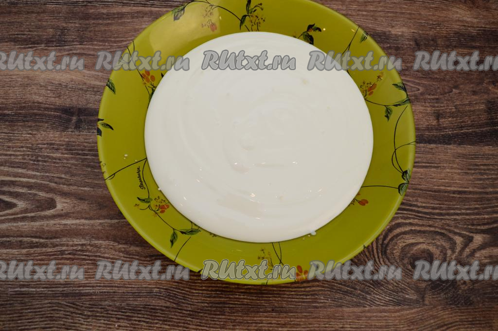 Отлить 400 миллилитров сметанно-кефирной массы в глубокую тарелку - эта масса нам потребуется в дальнейшем для приготовления бисквита.