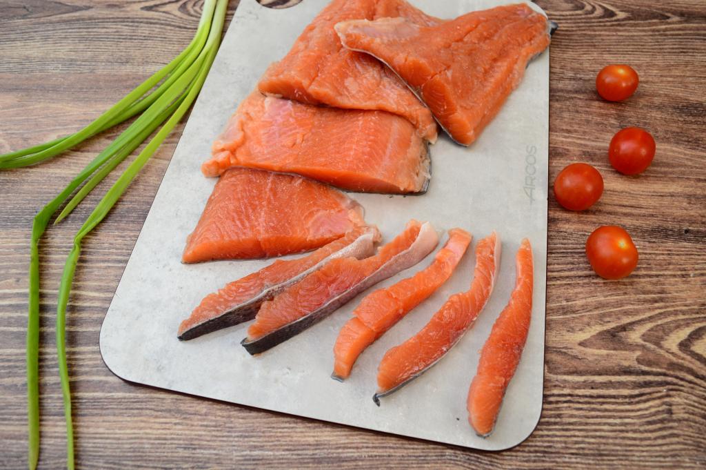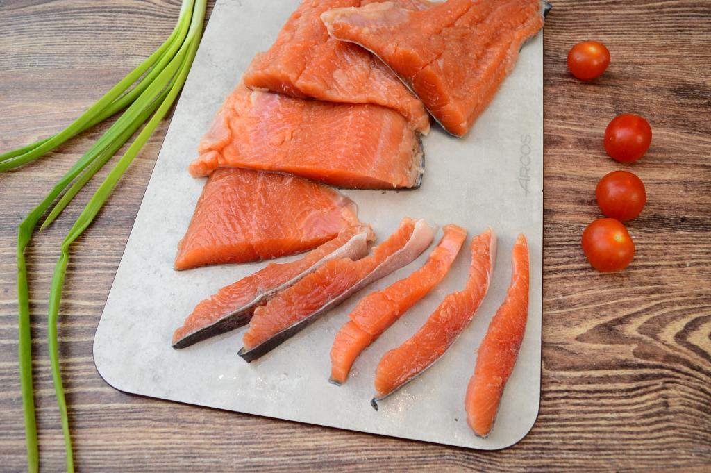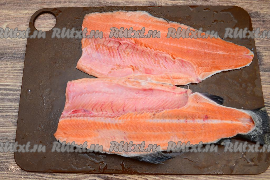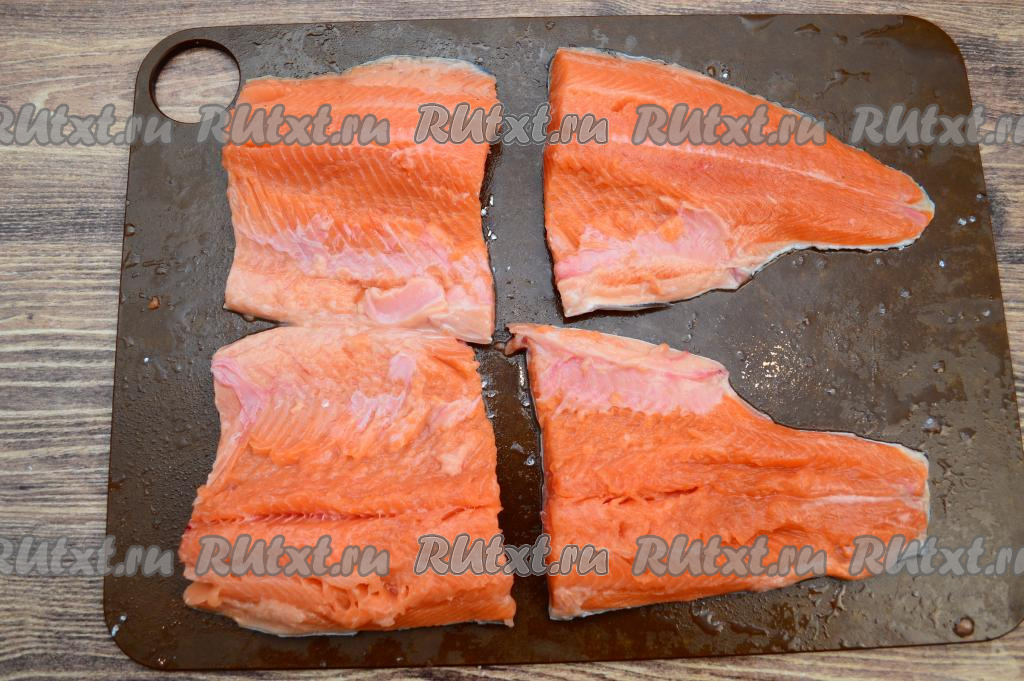 Разрезать каждое филе на две части. Выложить кусочки форели кожей вниз.