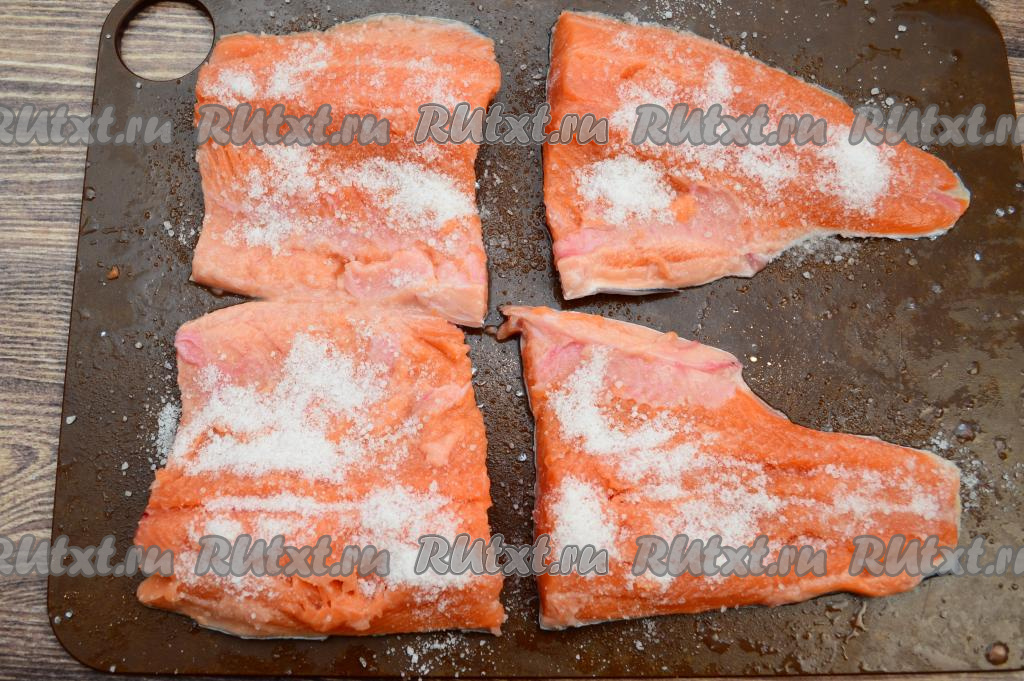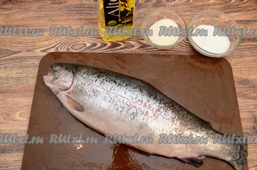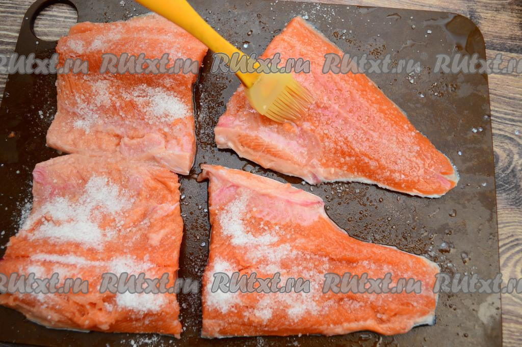 Хорошо присыпать смесью соли и сахара все кусочки форели.