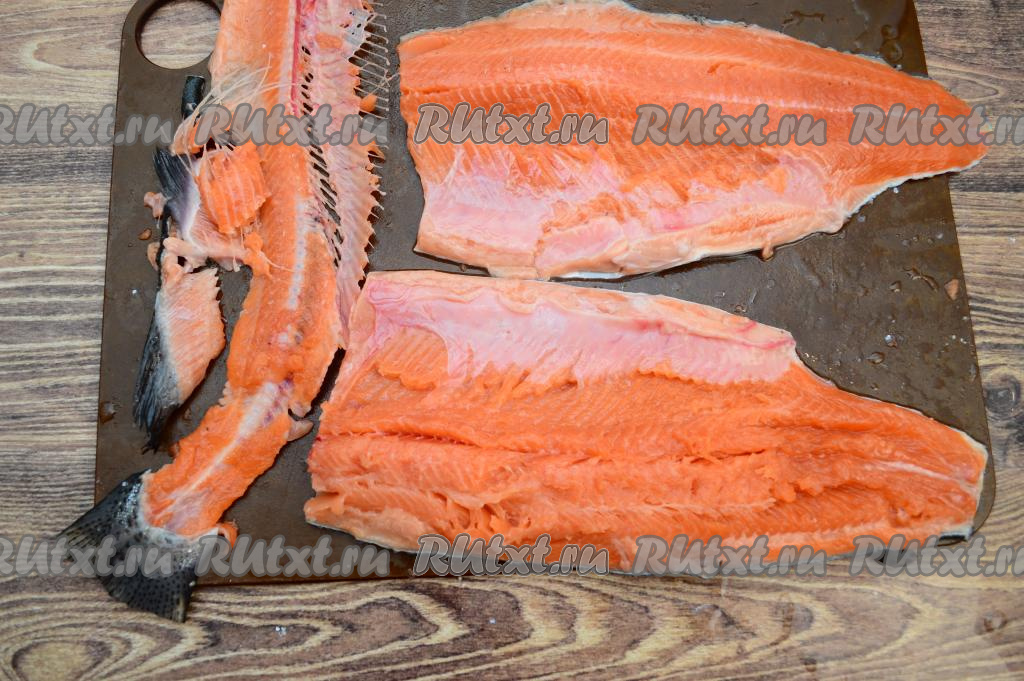 Теперь аккуратно отделить основную хребтовую кость вместе с хвостом, также отделить рёберные кости и срезать все плавники. Получатся 2 филе сёмги.