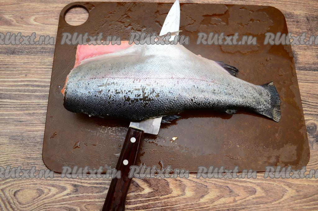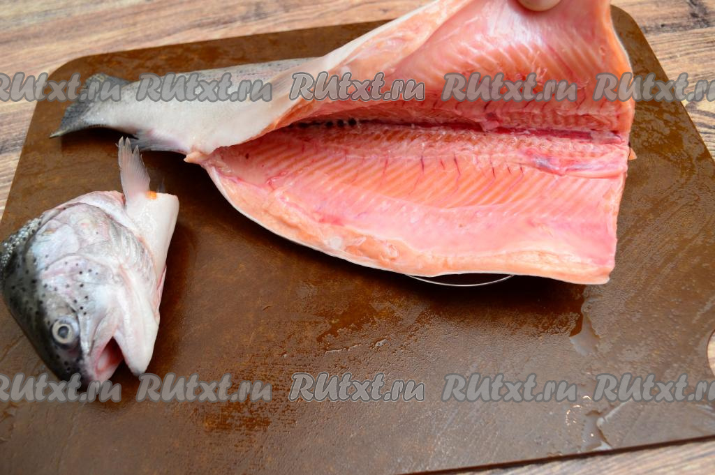 У рыбы отрезать голову, разрезать брюшко, убрать внутренности. Тщательно промыть брюшко внутри.