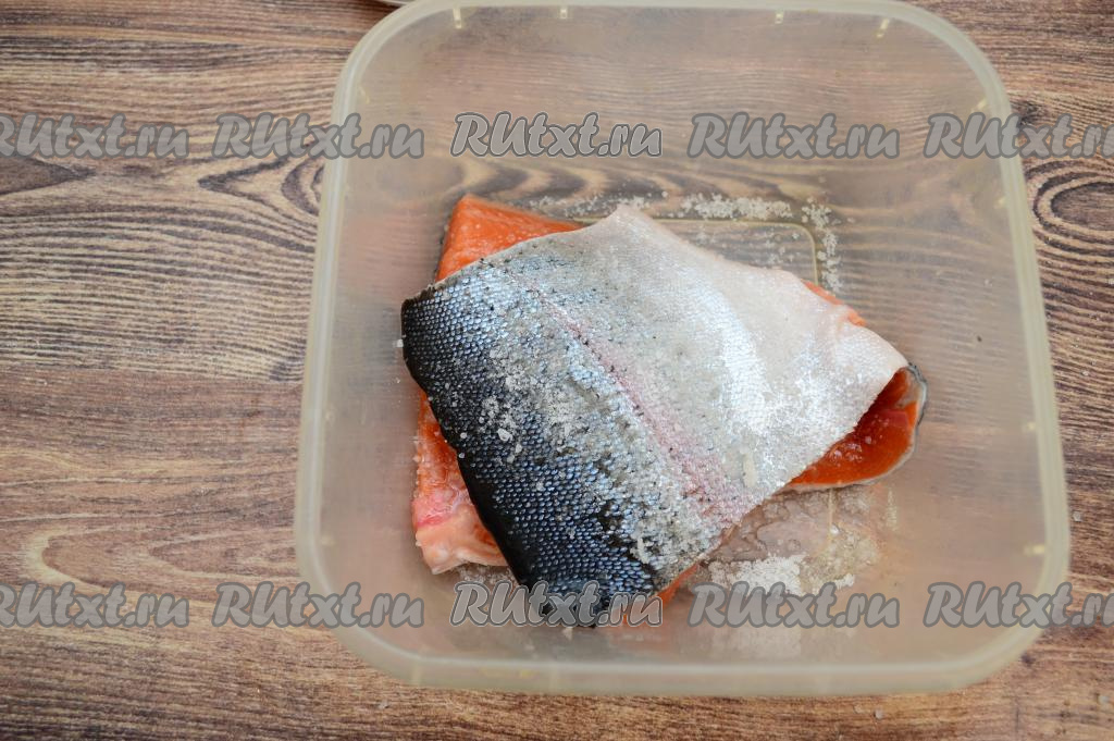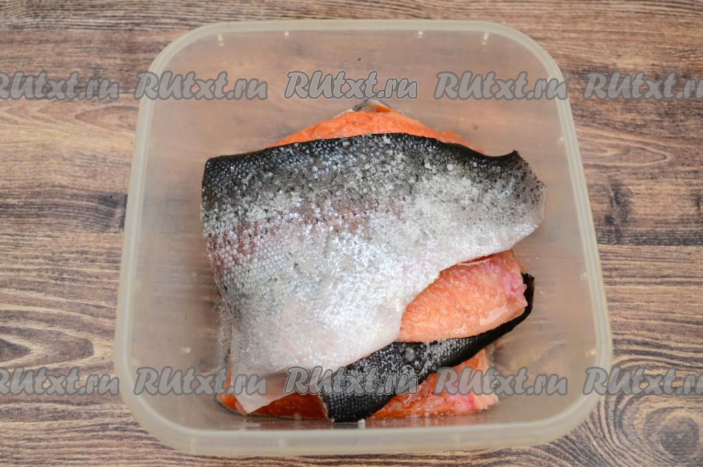 Аналогично уложить ещё два оставшихся кусочка красной рыбы. Закрыть контейнер (или кастрюльку) крышкой и отправить на 24 часа в холодильник. За это время кусочки рыбы можно один раз перевернуть, чтобы рыба более равномерно просолилась.