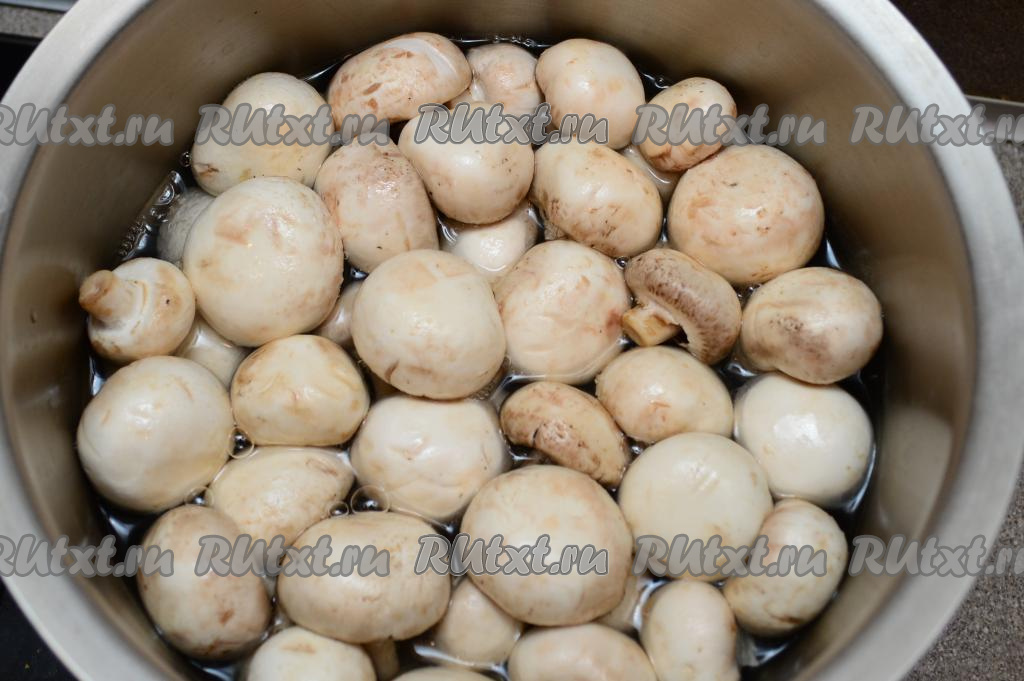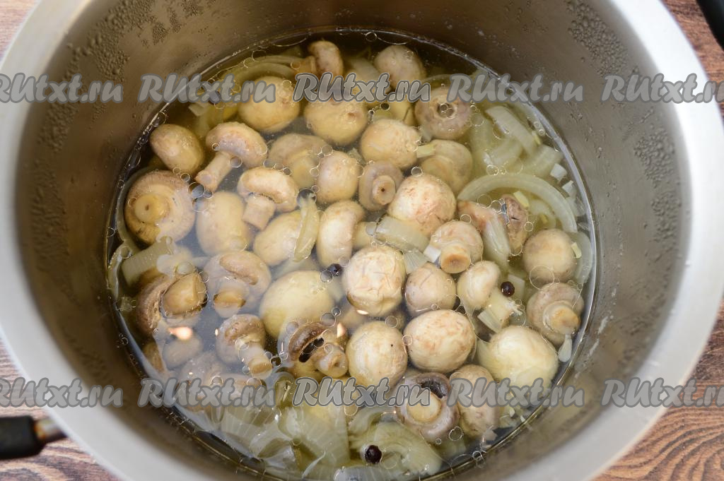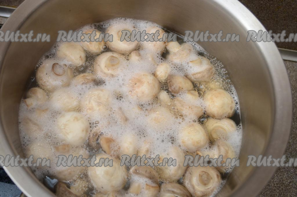 Когда вода закипит, проварить шампиньоны 6 минут на небольшом огне, затем откинуть грибочки на дуршлаг.