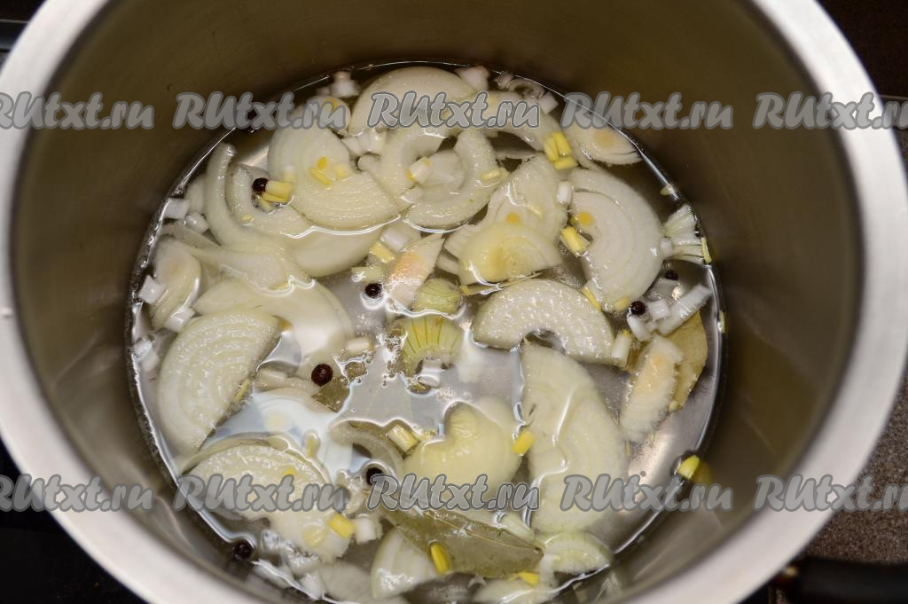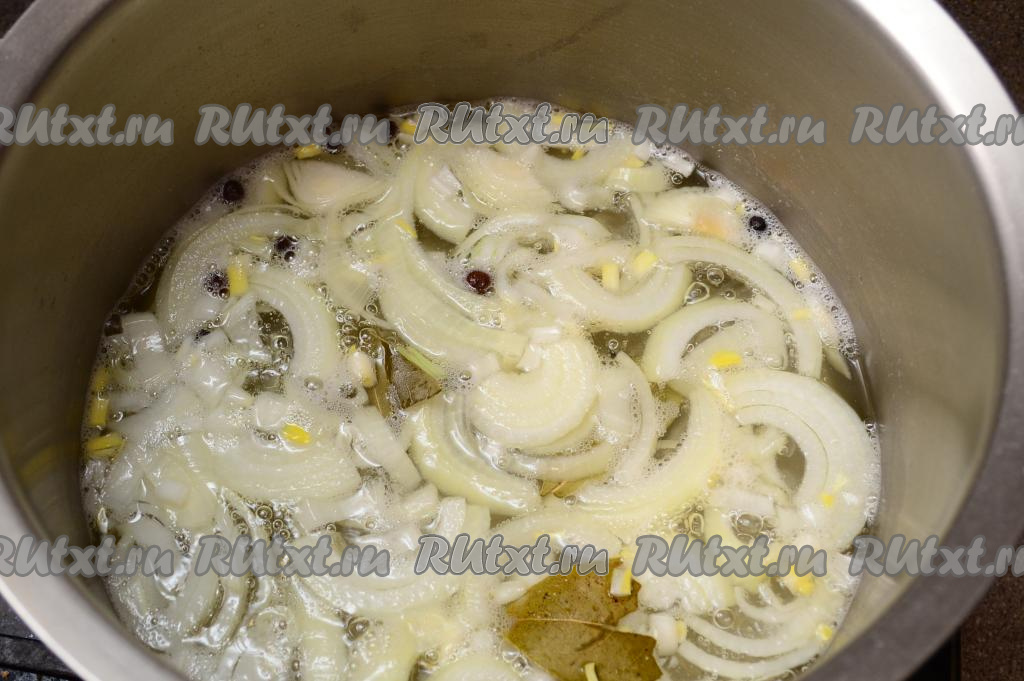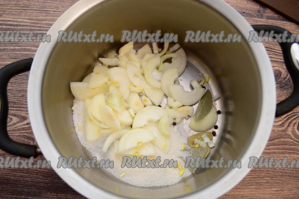 Лук очистить от шелухи, промыть водой. В кастрюлю всыпать сахар, соль, горошины чёрного и душистого перцев, добавить лавровые листья и нарезанный на полукольца лук.