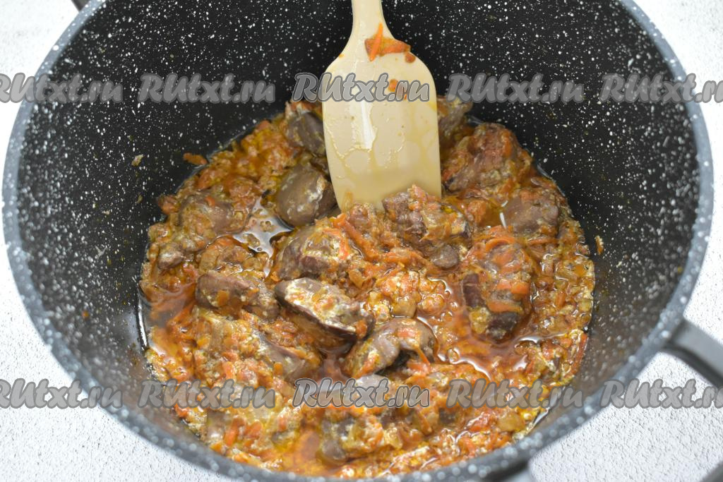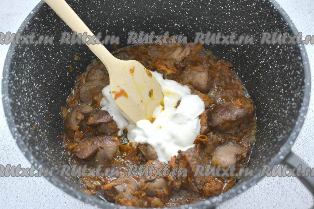 Перемешиваем, даём закипеть и, уменьшив до минимума огонь, тушим куриную печень с луком и морковью в сметане 2 минуты, выключаем огонь.