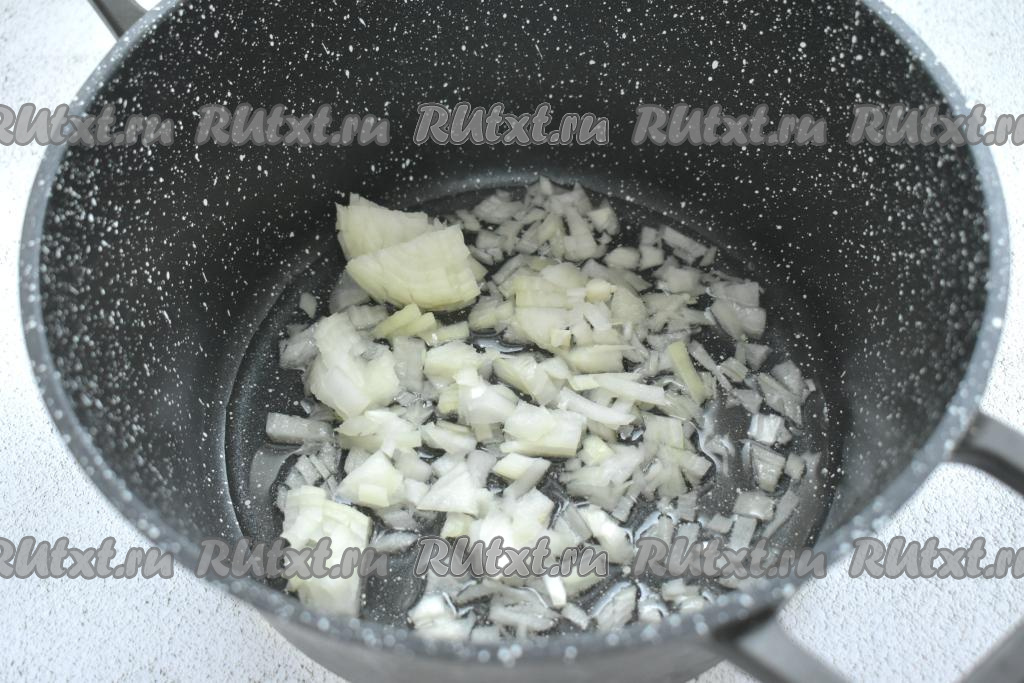 Очищаем лук с морковкой. В сотейнике (или в достаточно глубокой сковороде) прогреваем растительное масло, выкладываем мелко нарезанный лук и обжариваем его 3-4 минуты, периодически перемешивая, на среднем огне.
